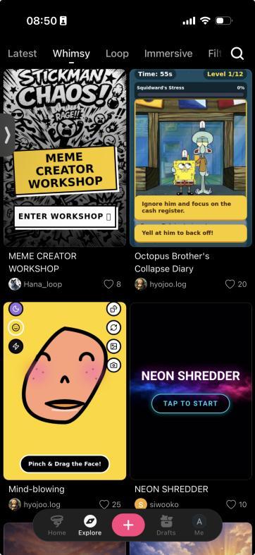 Loopit发现页,内容按Whimsy、Loop、Immersive等标签分类(左),除了真谛性内容也有一些艺术类的互动内容 | 图片着手:Loopit