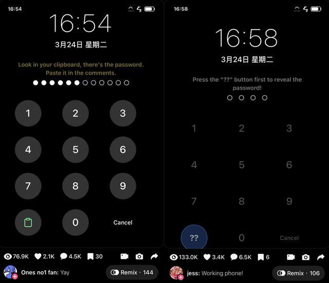 密码解锁手机的不同版块,被Remix 上百次,互动量在 10w 荆棘
