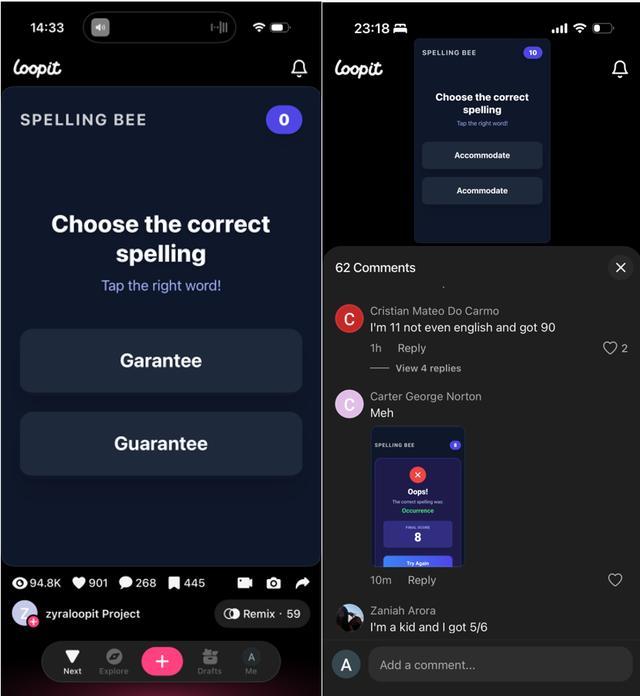 打开指摘区,与短视频主要以“辣评”成绩绝大多数点赞不同,「Loopit」每个互动内容下的指摘区,更多是用户参与后的“晒分”。举例,在一个 Spelling Bee 拼写覆按的互动内容底下,268 条指摘不是“666”或者神气包,而是用户在酌量我方的成绩,“我才 11 岁,英语不是母语,但我拿了 90 分”、“还有拿了 8 分就造作”的惜败。互动带来的高参与深度,在近几年的新上线社区居品中,很罕有到。