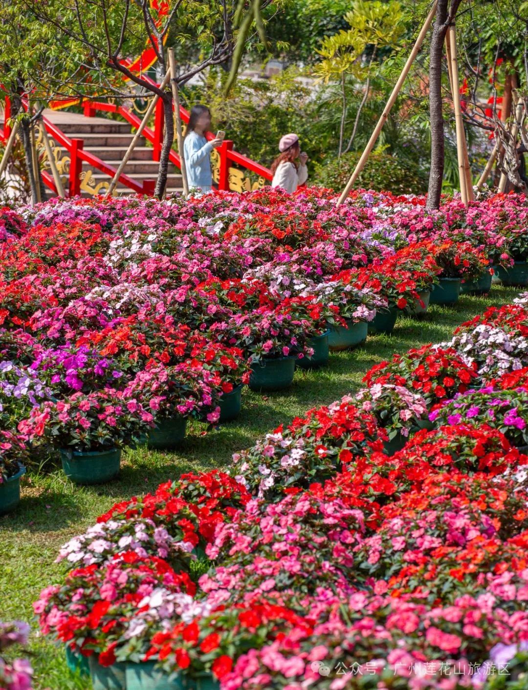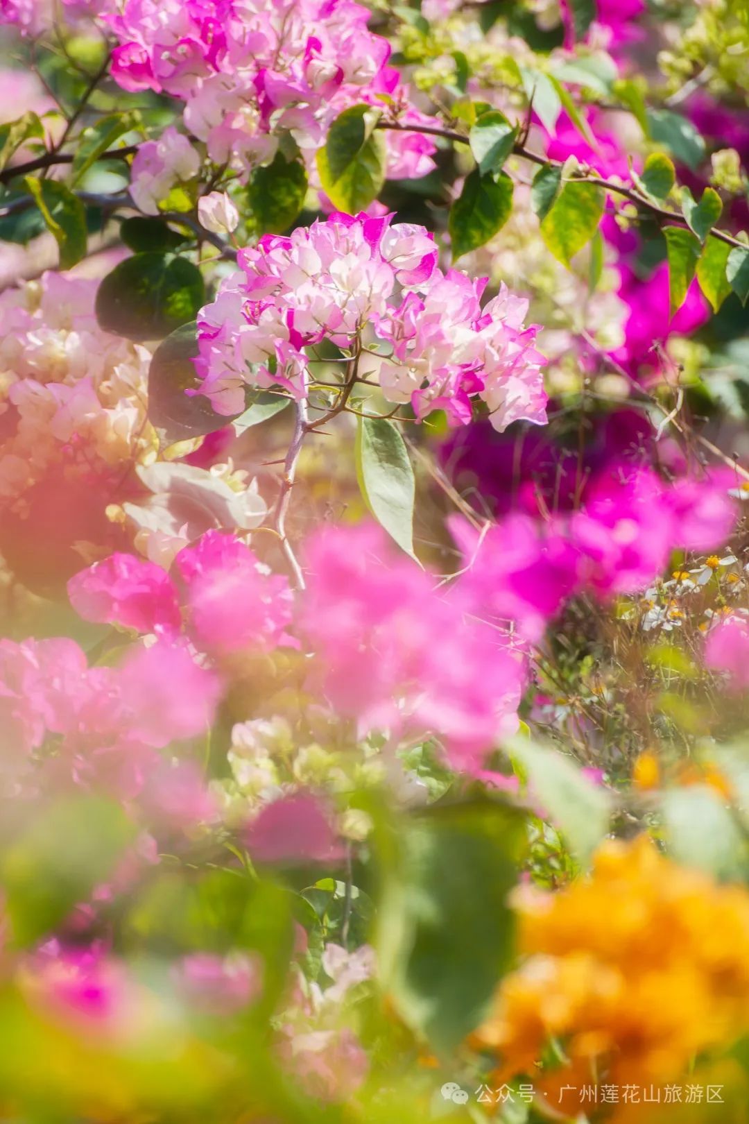 莲花山百花圃内宫粉紫荆织就绯云,波斯菊铺展成银河,三角梅、木棉花在晴空下灼灼似火,让东说念主仿佛闯入丹霞与花海的晴光画卷,诱骗不少市民旅客到此探春。